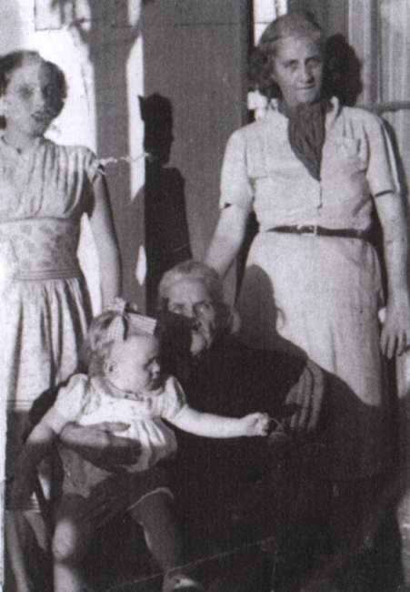 Doudou (André) Douyère et Jean-Pierre Boullé. Quatre générations : Mady Douyère née Boullé, Jacqueline Douyère sur les genoux de son arrière grand-mère Augustine Blancard née Boyer de la Giroday et Claire Boullé née Blancard. Devant la bâtisse de Mon